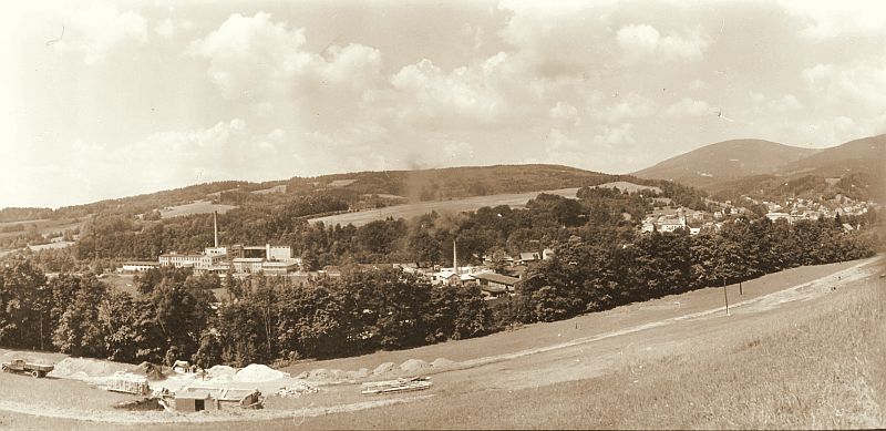 Panoramatický pohled na papírnu ze Sluneční stráně v začátcích výstavby rodinných domků v 7. dekádě minulého století - foto Josef Čermák