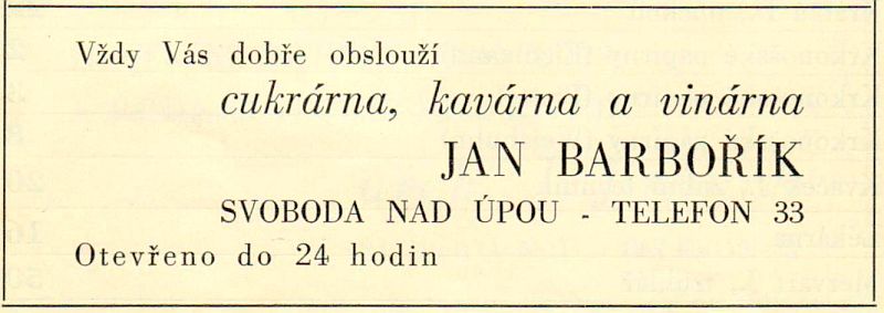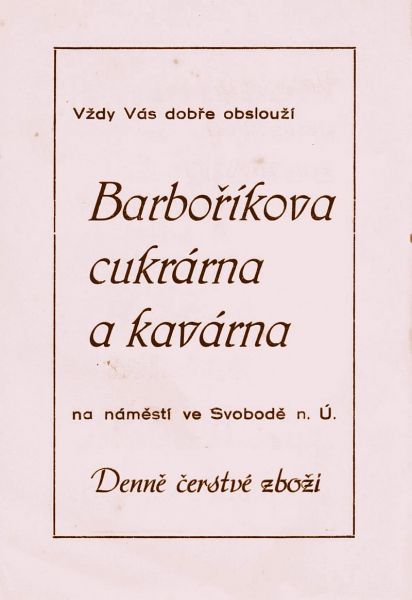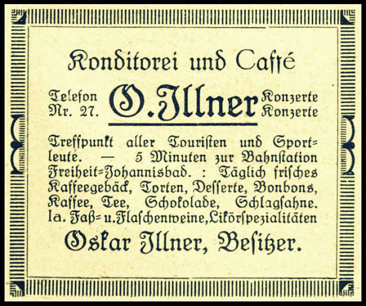 Takhle lapidárně by se dala vyjádřit několik desetiletí trvající existence vyhlášené cukrárny v rohovém domě čp. 102 (dnes 502) na náměstí ve Svobodě nad Úpou. Ať už jde o předválečnou éru „otce zakladatele" Oskara Illnera nebo poválečné intermezzo Jana Barboříka ukončené národním podnikem Pramen, později Potraviny. Pravidelní čtenáři „Střípků z dějin" mohou namítnout, že tohle téma je proprané jako porybného zimník. Ale u historie stačí několik let a vždycky se objeví něco nového na doplnění. (Viz citát největšího z Čechů Járy Cimrmana: „Historie se ustavičně mění, zatím co budoucnost zůstává stále taková, jaká bude"). Navíc opakování je, jak známo, matkou moudrosti. Také čtenářská obec se snad, doufám, časem mění. Kazem je použití stále stejných fotografií. Ale kde brát, když i na opakované výzvy k zapůjčení nikdo nereaguje?