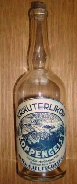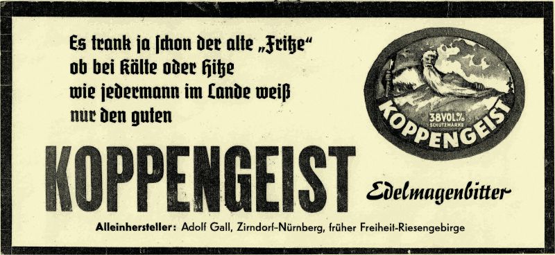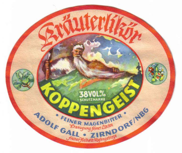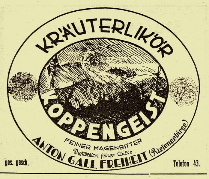 Prosinec to nejsou jen čtyři týdny rozjímání s postupným zapalováním svíček na adventním věnci. Ani pouze Vánoce s připomínkou Kristova narození s jesličkami, stromečkem a dárky. Ale také výbuch veselí na Silvestra s bujarou oslavou nového roku. A k tomu patří, jak by řekli ještě před tři čtvrtě stoletím rodilí Svoboďáci, šnaps. Pálenka, likér, kořalka. Pro jemnější nátury pivečko, pro dámy víno. Dnes je výběr bohatý jako v tom nejfantastičtějším snu notorického alkoholika. Tenkrát hrála prim domácí produkce. Na čepu byla lahodná tmavá osmička z Měšťanského pivovaru v Trutnově i řízný knížecí Klugeho světlý ležák z Rudníku. Ve Svobodě nad Úpou býval prý pro všechny bez rozdílu věku a pohlaví oblíbený bylinný likér. A nebyl to známý karlovarský třináctý pramen páně Bechera, ani „starý fotr" Praděd z Jeseníků, natož odvar z bezinek jaký míchal Rudla Jelínek, ale „Koppengeist" místního výrobce Antona Galla a jeho společníka a pokračovatele syna Alfonse vhodný pro každou příležitost. Základní suroviny v podobě léčivek bylo na horských stráních habaděj a místní ženy bývaly zkušené kořenářky. Sběr a sušení několika druhů bylin byla záležitost všech žen z rodiny. Zatímco čeští „paliči" ohnivé vody na západě Krkonoš volili nevynalézavé názvy pro své nápoje podle bylinného složení nebo jména výrobce jako „hořcouka" z kořenů hořce nebo „honcouka" od jména Honců, či „rezkovačka" z hospody Na Rezku, s výjimkou čábrčuku Krakonoše Janouška, německá složenina Koppengeist v sobě promyšleně skrývá několik významů. Koppe je všeobecně vrchol hory. Ve východních Krkonoších však znamená jednoznačně královnu pohoří Sněžku. Geist je duch, zjevení, strašidlo, to ví každý křížovkář. Čili Duch Sněžky, povšechně Duch hor. Lapidárně řečeno starý dobrý Krakonoš, zvlášť když je název doplněn výmluvným obrázkem. Rafinovanost je skryta v detailu. Je to i jeden z německých výrazů pro líh - lihovinu, pálenku, destilát, špiritus, šnaps.