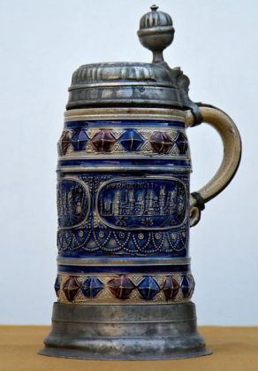 Dekorativní džbán na pivo, korbel či holba, co do obsahu spíš tuplák, z německé tvrdé kameniny v základní šedé barvě se solnou kobaltovou a manganovou glazurou, podle všech indicií z některé manufaktury ve Westerwaldu v Porýní, je zhotoven tradiční technikou na hrnčířském kruhu a opatřen stylovou barokní cínovou montáží. Nalepovaný, převážně modrý reliéfní dekor, je ve středovém pásu tvořen třemi opakujícími se vedutami s architektonickými dominantními motivy města Norimberka a krajkovou výzdobou. Nahoře i dole ho ohraničuje nekonečný razítkový pásek se střídavými modrými a fialově hnědými na koso postavenými plastickými čtverci s vyznačenými úhlopříčkami. Na víku je pravděpodobně dodatečně vyryt emblém kovářského a podkovářského cechu, sestávající z podkovy a charakteristického kovářského nářadí, s datací letopočtem 1760 a iniciálami J. P. P. Nádoba patřila s největší pravděpodobností k početnému mobiliáři domácnosti svobodského papírenského podnikatele Prospera Piettte - Rivage jako po léta děděná a vážená rodinná památka.