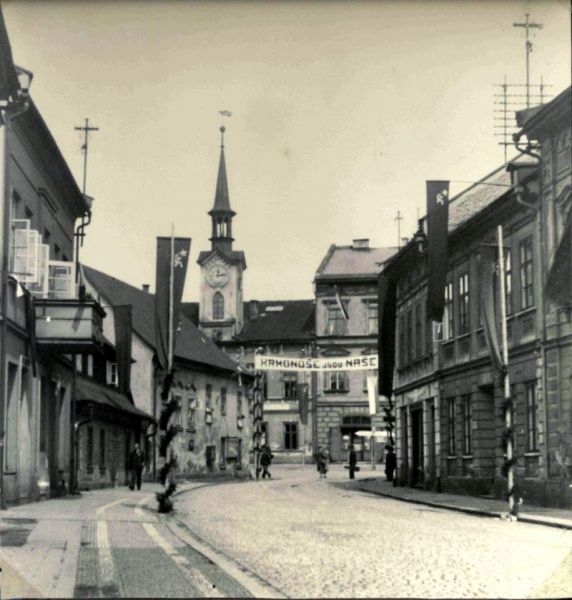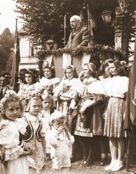 Záměrně vynechávám smyšlenou bajku o připravovaném atentátu, za kterou ve vykonstruované a nikdy zcela neobjasněné akci zaplatil životem hajný Sagasser z Pece pod Sněžkou. Vzhledem k aféře byla návštěva ministra o týden odložena na 19. srpna 1945. Na pamětním plechovém odznaku vydaném v euforii místní stranickou organizací je tak k matení neznalých dějepisců nesprávné datum. Ale to u party, jejíž velký vzor slavil říjnovou revoluci v listopadu, nijak nepřekvapuje. Roztržitý profesor, kontroverzní historik a zaslepený politik, který se na „stará" kolena stal terčem mnoha nelichotivých vtipů, trousil svá moudra z improvizované tribuny na zaplněném náměstí pod sochou Bohorodičky. Dokonce to prý v projevu zdůraznil a kronikář zaznamenal. Už je to tři čtvrtě století a úměrně k tomu mezi námi chodí ubývající počet pamětníků a očitých svědků. V mnoha domácnostech však dosud schraňují fotografie, takže událost není zcela neznámá ani potomkům. Také v pozůstalosti drogisty Vlastimila Háka zůstala série amatérských momentek, nejsou ale příliš ostré pro reprodukci. Na úvod abych zachoval styl, jsem použil dobovou pohlednici se zdařilou karikaturou od litomyšlského rodáka Vladimíra Vícha vydanou ke stému výročí narození letitého ministra v posledním období už bez portfeje, který mnoha generacím čtenářů dokonale znechutil Jiráska. Na prvním snímku vítá vzácného hosta papaláš z ONV v Trutnově jistý soudruh Novotný. Krojovanou stafáž u řečnické tribuny tvořili školáci a mládež. Plechový odznak z té doby se zneuctěním Sněžky pohozeným stranickým vercajkem je dnes sběratelsky hledanou kuriozitou. Záběr z vyšňořené ulice plné očekávání pořídil mimo jiných i Vlastimil Hák. Autorství ostatních fotografií není doloženo. Osobně bych vsadil na pana Jičínského. Slavnostní dožínkový průvod ze svobodského náměstí Svornosti do Janských Lázní vedli mládenci se švarnou dívčinou v kroji na koních. Noví osídlenci „ze za Paky" si hrdě hráli na slavnou Selskou jízdu z vnitrozemí. Tenkrát se ještě těšil vážnosti vedle uniformovaných sokolů i obnovený Junák, takže v čele průvodu pochodovala početná skupina skautů a skautek. Už při řazení na náměstí před vyzdobeným domem mého budoucího tchána bylo jasné, že bez oslavných transparentů to nepůjde. Pořádek při slavnosti, která připomínala manévry ozbrojených složek, zajišťovali početní příslušníci formujícího se Sboru národní bezpečnosti a vojáci Československé lidové armády.