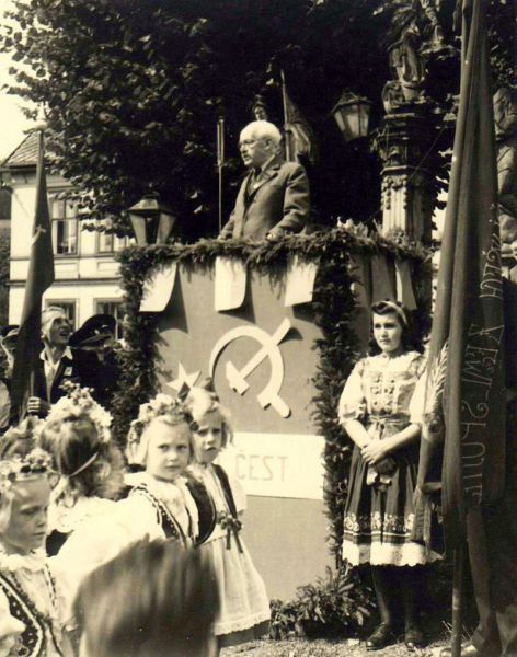 Občas je mi vytýkáno, že ve svých textech z historie Svobody nad Úpou příliš straním Němcům. Jenže já nemám na vybranou. Krajinu východních Krkonoš včetně našeho Úpského údolí obývalo po staletí převážně německé etnikum, což je nezpochybnitelné historické faktum. Kdyby se tu byli v dávných časech usadili Čingischánovi nájezdníci, nezbylo by než psát v zájmu pravdivosti dějin o Mongolech. Stejně tak nelze přeskočit období vlády proletariátu po roce 1945, ve kterém jsme každý podle svého svědomí žili. Podotýkám, že vracet se ve vzpomínkách kupředu levá k budování šťastných zítřků pod vedením strany a vlády v nerozborném přátelství se Sovětským svazem není zrovna šálek mého oblíbeného čaje. Abych ale uspokojil tu nezanedbatelnou část pamětníků, kteří celý život nadávali na režim a dnes bezostyšně tvrdí, že za komoušů bylo líp, vybral jsem pár raně poválečných fotografií z údajně ztracené přílohy k obecní kronice, kterou kamarád naštěstí stihl před lety ofotit. Jednou z prvních bohatě zdokumentovaných událostí byla návštěva Zdeňka Nejedlého (1878 - 1962), který byl v té době ministrem školství a osvěty ve vládě premiéra Zdeňka Fierlingera.