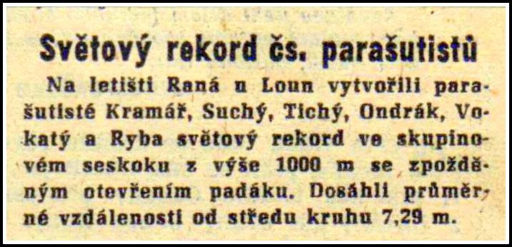 Jak tak netečně listuji novinami v zubařské čekárně, padl mi do očí článeček o světovém rekordu armádního družstva výsadkářů ve skupinovém seskoku na cíl v Plzni. Zajímavé bylo totiž složení družstva: Tichý, Ryba, Dostál a ještě kdosi. Jména známá i mé ženě, patřila zároveň kamarádům z naší roty. Okamžitě jsem zavětřil téma na nejméně dva další dopisy a navíc příležitost k dle mého tehdejšího soudu roztomilému kanadskému žertíku. V následujícím dopise jsem se omluvil za odmlku, zaviněnou nečekaným mimořádným cvičením kdesi u Plzně. Druhý den jsem si vychutnal sdělením o spojení cvičení s armádními mezinárodními přebory v seskocích na přesnost přistání, a jak se to našemu družstvu nějakou vzácnou shodou náhod mimořádně povedlo. Zalitoval jsem jen, že jsme museli předčasně odejet ještě před vyhlášením výsledků, takže ani nevím, jak jsme se umístili. Do třetí obálky jsem se vší svou vrozenou skromností vložil jako bonbónek ten inkriminovaný článek. Doufal jsem, že každý trochu soudný člověk při srovnání mých pěti či šesti začátečnických seskoků a světového rekordu hned pozná, která bije. Nikdy však neočekávejte logickou úvahu od ženy. Dokonce ani od vlastní. Zpráva se rozlétla vlastním životem. Novinový článek měl větší váhu, než mé pozdější vysvětlování a jsou tací, kteří tomu věří dodnes. Jedním z nich byl i můj táta. Celý život chtěl mít ze mě chlapa. V tomhle směru jsem mu asi moc radostí neudělal. Když jsem viděl, jak je na můj „výkon" svým zvláštním způsobem hrdý, nedokázal jsem mu tu radost zkazit. Zemřel krátce po mém příchodu z vojny. Snad mi při posledním účtování tu nevinou lež promine.
