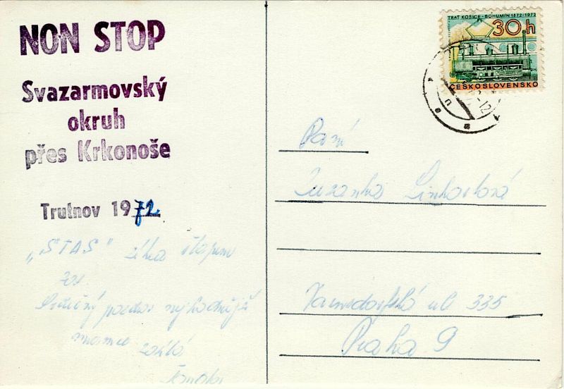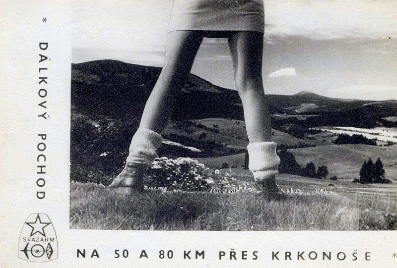 Na vzniku plakátku, ze kterého vznikla nakonec i poštovní pohlednice s neuměle nalajnovanými řádky na jinak čisté adresní straně bez jakékoliv značky, loga či firmy vydavatele, lze při zpětném nahlédnutí „do kuchyně" dokumentovat docela pracný postup oproti dnešním možnostem virtuálního zpracování jakéhokoliv námětu. Čirou náhodou mám originální návrh k dispozici. Prvotní je samozřejmě nápad - pak už to údajně jde samo. Předpokládám, že na čistou čtvrtku kreslicího papíru formátu A 4 pracně obtiskovacími písmeny z Propisotu, což byl tehdejší šlágr amatérských grafiků, rozmístil text. Pověstné prázdné místo vlevo dole je rafinovaně ponecháno pro logo všemocné zaštiťující organizace. (Ta chyba v kilometráži skutečně na předloze existuje - zřejmě momentálně došly nuly). O zajímavé záběry na Krkonoše neměl Standa ve svém fotoarchivu nouzi. V tomto případě použil vděčný pohled staršího data z úpatí Kravího vrchu nad dnešní chráněnou přírodní památkou Slunečná stráň s ještě zachovalou kapličkou Vzkříšení směrem ke vzdálené královně pohoří Sněžce s blízkým masivem Světlé vlevo a nalepil ho k nápisu na podložce. Z jiné fotografie vystřihnul rádoby turisticky působící „hnáty" té modelky a nalepil je do kompozice. Celé znovu ofotil a fertig! Existuje dokonce i důkaz, že takto zhotovenou pohlednici dopravila v roce 1972 Česká pošta dálkovým pochodem až do Prahy, až do Prahy, až do Prahy. Kdyby podepsaný Tonda ještě navíc byl celoživotní tramp, kytarista, zpěvák a písničkář Antonín „Tony" Linhart, kapelník folkové, trampské a country skupiny Pacifik, to by teprve byla rarita!