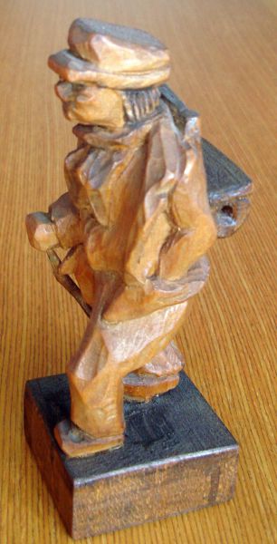 Dnes je teprve středa 15. tak bych rád představil jinou nesourodou trojici „koppentrégrů", kteří už dlouho nevytáhli paty z jedné chalupy v podhůří. U toho prvního je dokonce na místě známá hláška „ ...protože je dřevěnej". Vyřezal ho údajně řezbářský samouk Rudolf Podstata, boudař, průvodce turistů, člen Horské služby a hlavně představitel pohádkového Krakonoše ze Špindlerova Mlýna. Celková výška nahrubo řezané figurky horáka s krosnou z přimořeného lipového dřeva je asi 16 cm a provedením zapadá do řady charakteristických a svérázných postaviček z jeho dílny. Druhý panáček nezapře inspiraci v ilustracích krkonošských krojů z 18. století od znalce Krkonoš Josefa Karla Eduarda Hosera (1770 - 1848). Z cínu jej podle vlastního modelu odlil a vlastnoručně omaloval současný všestranný umělec a výrobce cínových betlémů z Přibyslavi u Nového Města nad Metují trutnovský rodák Petr Rýgr. Miniaturní trojrozměrná plastická postavička s pečlivě provedenými detaily měří od země po nejvyšší bod konstrukce krosny všeho všudy 5,5 cm a je nabízena jako originální suvenýr z Krkonoš. Relativně nejmladší z nich, i když historicky nejstarší je velikostně nejmenší plochý lisovaný a polychromovaný cínový prcek zvíci pouhých 35 milimetrů v dobovém oblečení s třírohým kloboukem v ruce. Tradiční výrobek německé provenience z meziválečného období 20. století je dnes ceněný sběratelský kousek, jaký by dal dětem na hraní jen velmi tolerantní a cenových relací na sběratelském trhu absolutně neznalý rodič. Všichni tři drží palce současnému slovenskému kolegovi šerpovi Hižnayovi z Vysokých Tater, kde nosičské řemeslo stále žije, i jeho souputníkům.